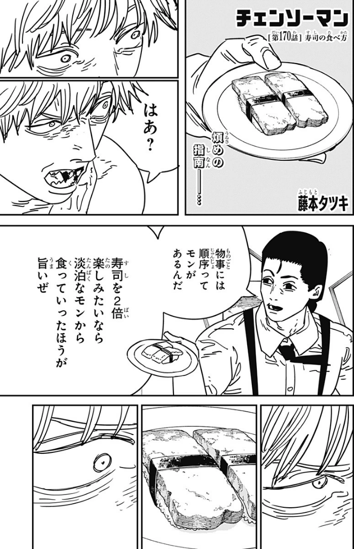 Cómo comer sushi (寿司の食べ方, Sushi no tabekata) es el centésimo septuagésimo capítulo del manga Chainsaw Man y el septuagésimo tercer capítulo de la Parte 2.
