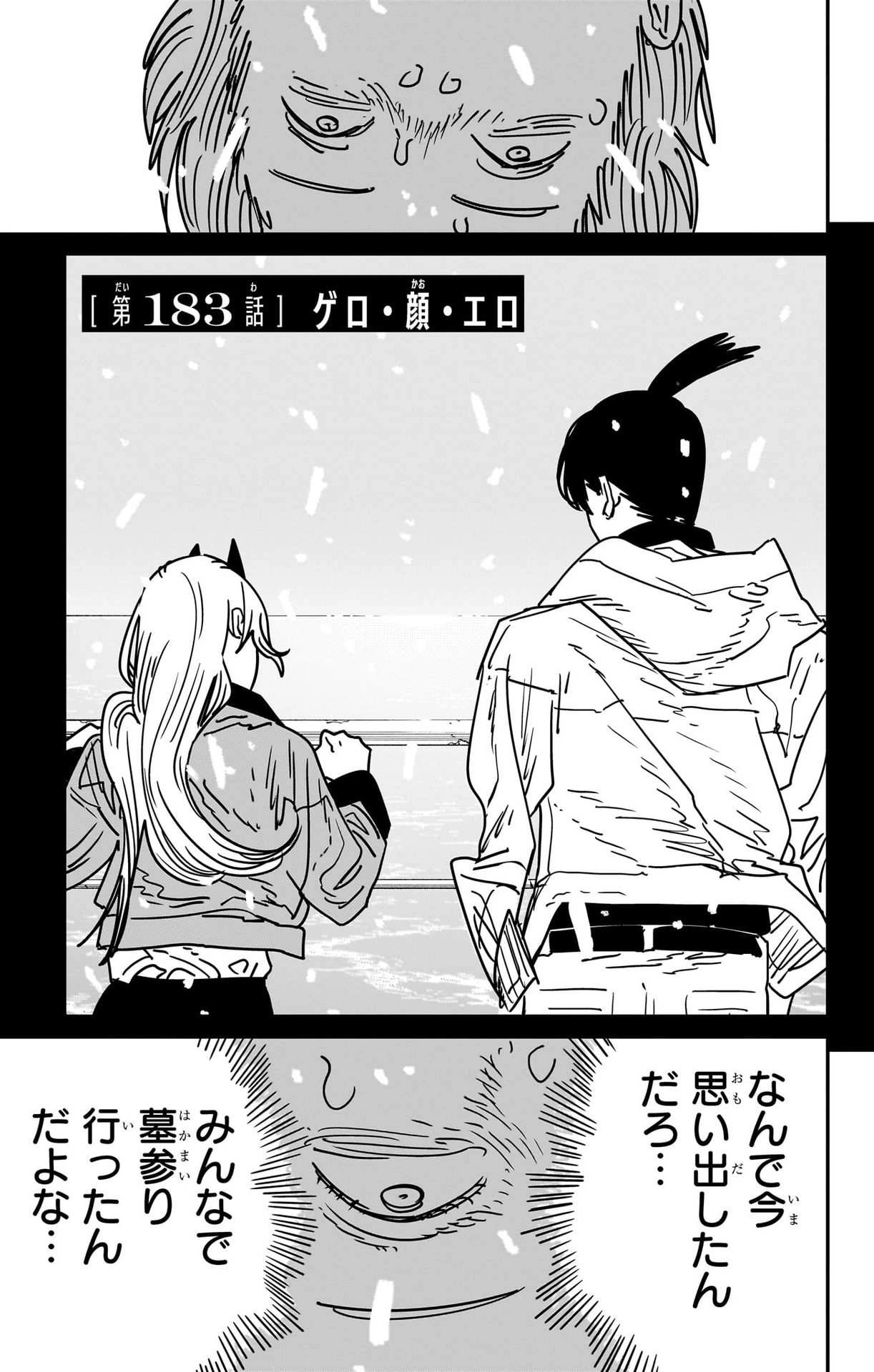Upon remembering his trip to Hokkaido with Aki and Power, Denji wonders why he's suddenly remembering them before puking out the Bitterness Devil. Feeling a bitter taste within his mouth, Denji jumps into the lake nearby to refresh himself. Slowly descending underwater, Denji remembers the bitter coffee he shared with Reze at the Crossroads café. As the memory of Reze turns around to face Denji, he laments the painful reality that his loved ones keep disappearing from his life. Denji continues sinking deeper before a vision of Nayuta, Meowy, and their dogs enters his mind, reminding him of the bonds he still holds dear.