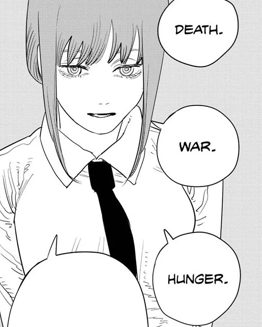 Makima reveals the existence of the Four Horsemen amid her presumed fight against Chainsaw Man, describing how she, the other three Horsemen, and the Weapon Devils fought against Pochita in Hell until the battle abruptly ended, when Pochita vanished before their eyes. With the Weapon Hybrids present, she announces that the interrupted battle can finally be brought to an end, as she orders the Hybrids to attack Chainsaw Man.[116]